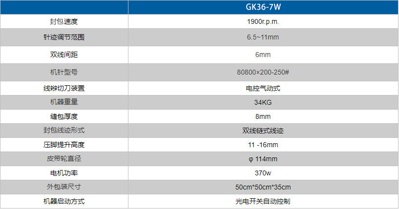 GK36-7W全自動雙針四線全自動封包機采用雙機針縫合,一次縫兩趟線,牢固可靠,可實現(xiàn)無泄漏封包,適合于對縫口有嚴格要求的廠家對紙袋、塑編袋、布袋等的封包縫口。采用 光電開關自動控制啟停機、電控氣動式切刀自動剪切線辮,適合于自動化程度較高的化工廠、倉庫、碼頭等流水線縫包。